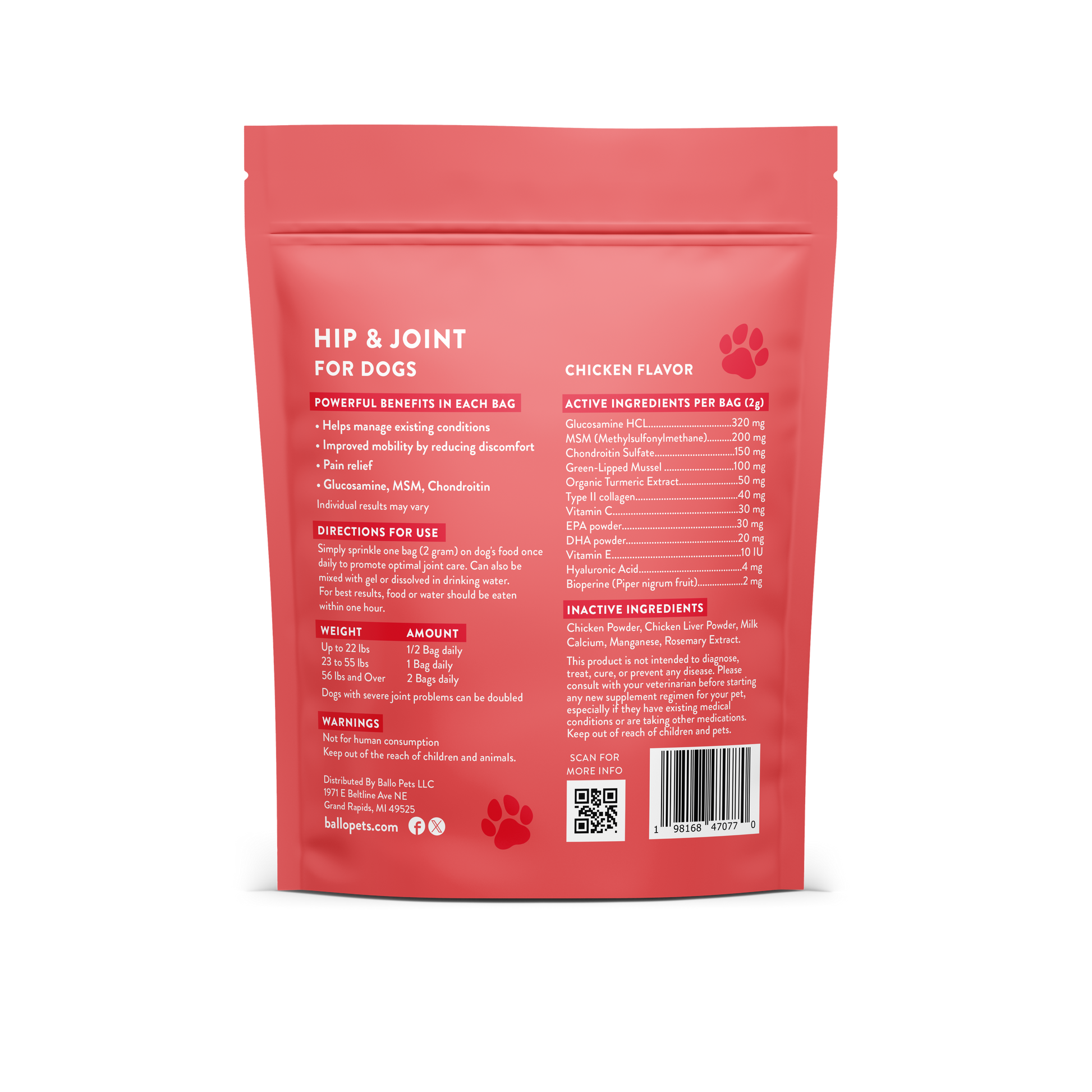Ballo Pets Hip & Joint Supplement for Dogs: Provides comprehensive support for your canine companion's mobility and flexibility. Formulated with Glucosamine, Chondroitin, and MSM, these powder packets help maintain healthy joints, cartilage, and connective tissues. The supplement is designed to alleviate discomfort associated with normal daily exercise and activity, allowing your furry friend to stay active and playful. Each bag contains 30 servings (30 powder packets), making it a convenient and long-lasting solution. Suitable for dogs of all breeds and sizes, this supplement can be easily administered by mixing it with your pet's food or treating them directly. Promote your dog's overall well-being and give them the freedom to run, jump, and play without limitations.